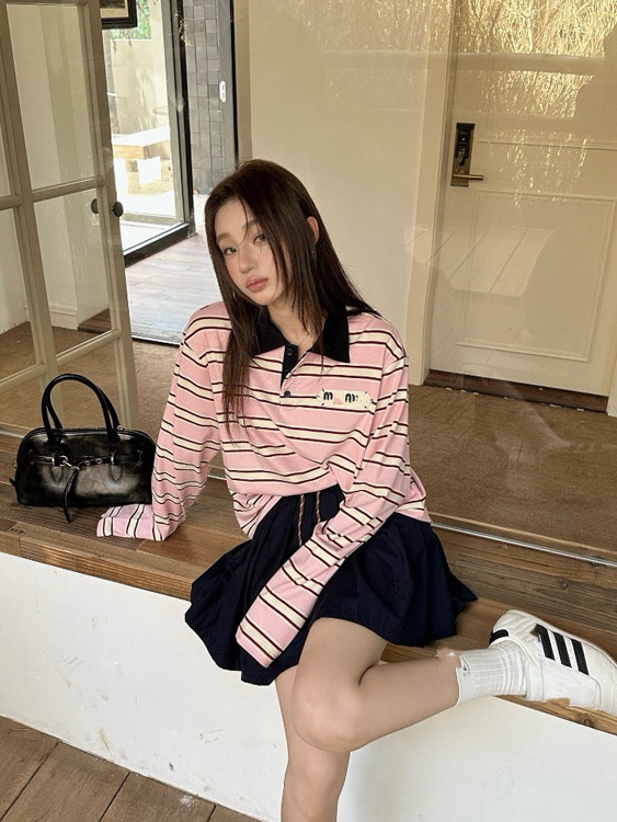 Home > Miu Miu's new collared patchwork casual versatile polo shirt T-shirt-5371